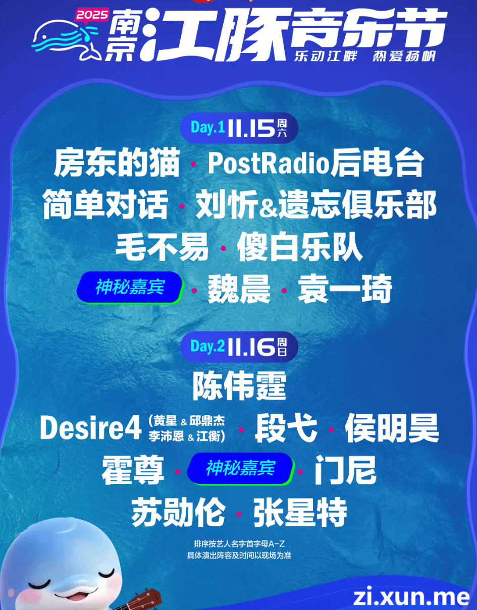 2025南京江豚音乐节演出阵容及时间表 时间: 2025-10-23 分类: 文体娱乐 演出时间:2025年11月15日、16日演出地点:江苏省 南京市 建邺区 江心洲生态科技岛具体演出时间细节持续更新ing,敬请留意。
