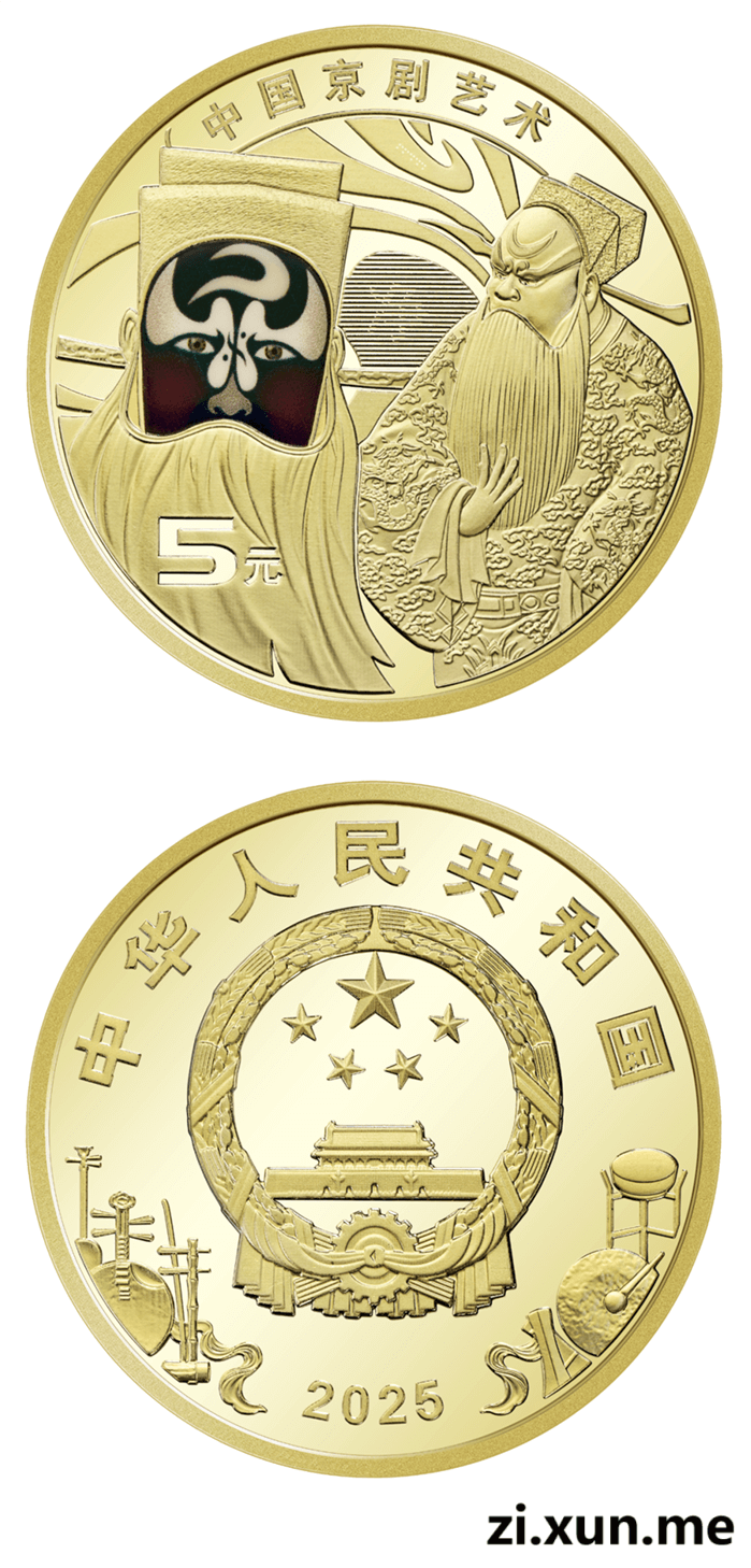 2025中国京剧艺术普通纪念币 时间: 2025-11-03 分类: 其他 中国人民银行定于2025年11月25日发行中国京剧艺术普通纪念币一枚。纪念币正面主图案为中华人民共和国国徽,国徽上方刊“中华人民共和国”国名,下方刊年号“2025”字样,辅以中国戏曲乐器图案;背面主图案为中国京剧艺术中净角形象,局部为彩色图案,辅以装饰化图形,并刊“中国京剧艺术”及面额“5元”字样。