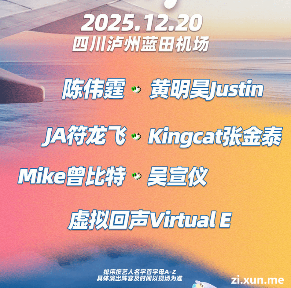 2025泸州酒城乐航音乐节演出阵容及时间表 时间: 2025-12-02 分类: 文体娱乐 演出时间:2025年12月20日演出地点:四川省 泸州市 泸州蓝田机场具体演出时间细节持续更新ing,敬请留意。