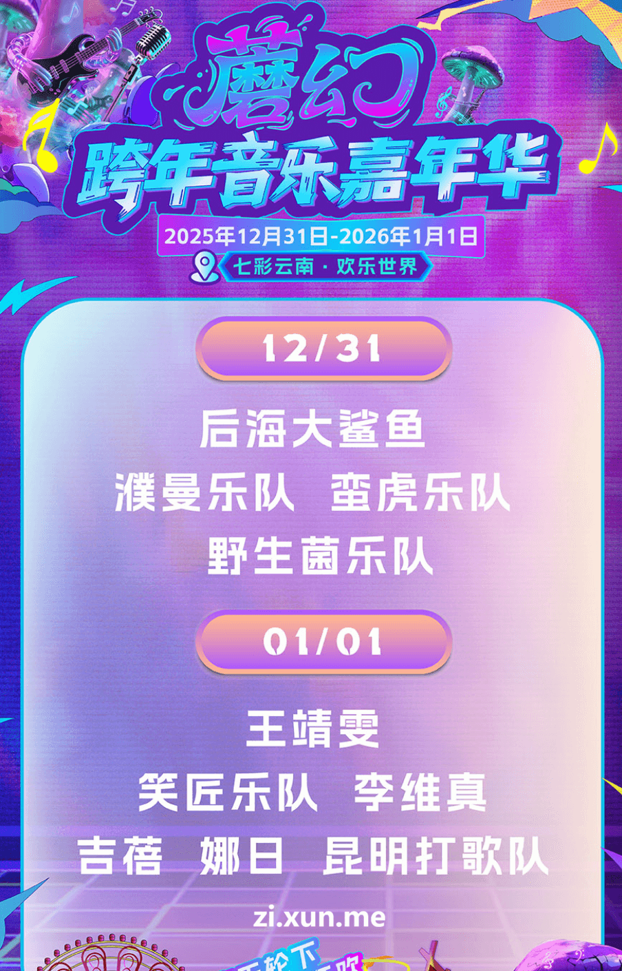 2025-2026昆明蘑幻跨年音乐嘉年华演出阵容及时间表 时间: 2025-12-18 分类: 文体娱乐 演出时间:2025年12月31日演出地点:云南省 昆明市 七彩云南·欢乐世界具体演出时间细节持续更新ing,敬请留意。