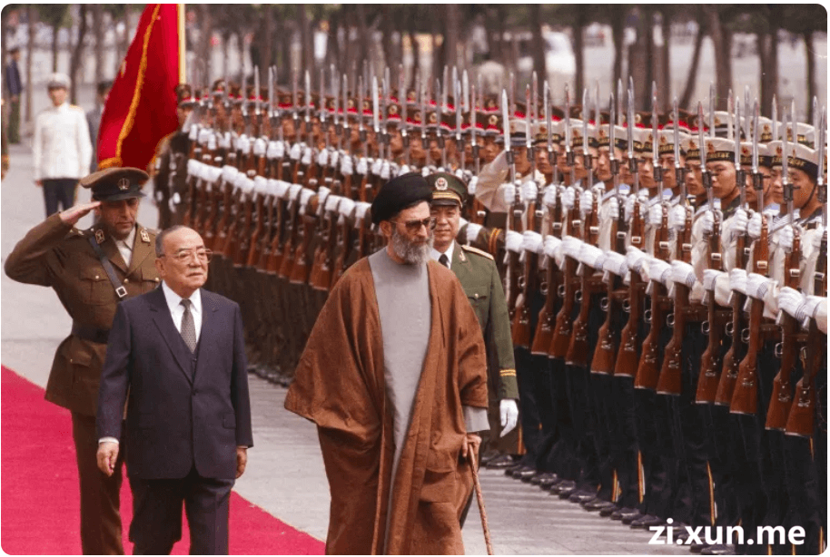 照片拍摄于1989年5月9日,时任伊朗总统的哈梅内伊对中国北京进行正式访问,图为他在人民大会堂前检阅仪仗队。